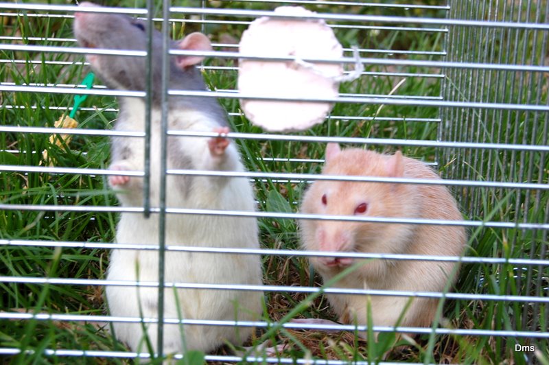 Картина. Веранда, день, на полке стоит клетка открытая, по клетке/полке прыгают крысы, внизу стоит стул, на стуле спит Трифон (кот) - сторожит крыс, чтобы никто не обидел. Как какой-нить чужой кот засовывает нос на веранду, сражу шипение, крысы в клетку, а чужой кот на улицу. Вот так и живем.