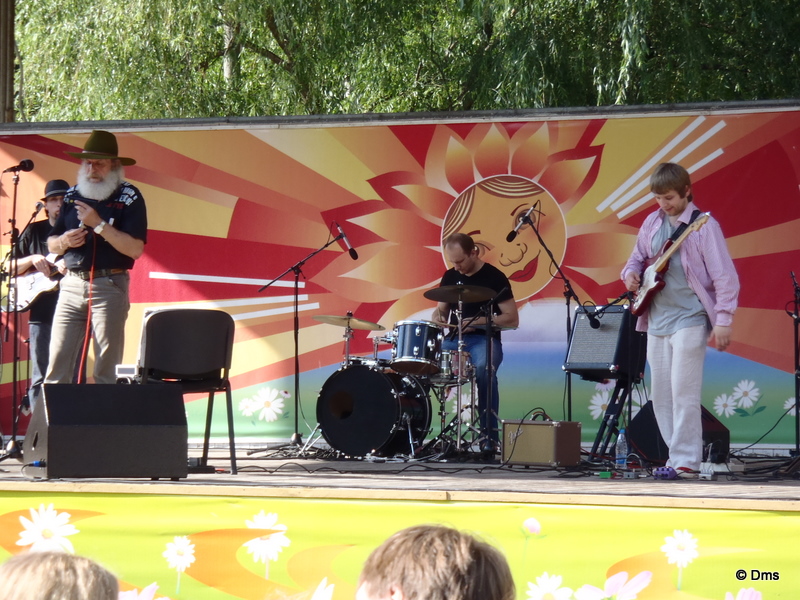 Посмотрев и покатав по окрестностям, я двинул в сторону Сокольников, хотел себе купить зеркало на вел. Очень удобно ездить по улицам с зеркалом, один минус, очень быстро ломаются у меня эти зеркала. Переехал через ш.Энтузиастов, и нырнул в Измайловский парк. Еду себе по очень мокрым дорожкам и вдруг слышу вкусный такой звук раздается невдалеке. Тк я свободный никуданеторопящийся мужчина, то двинул на звук. Звук хорошей блюзово-джазовой банды. Приехал. Вход свободный. Поставил вел. Сел и стал наслаждаться концертом команды "Hot rod band".