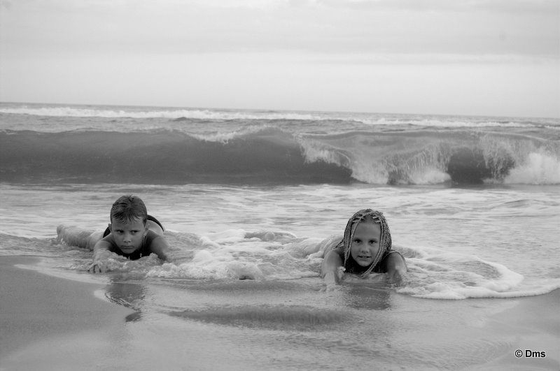Мне кажется, что Сережка смотрит на воду, которая течет сквозь пальцы, а Олька просто позирует :)