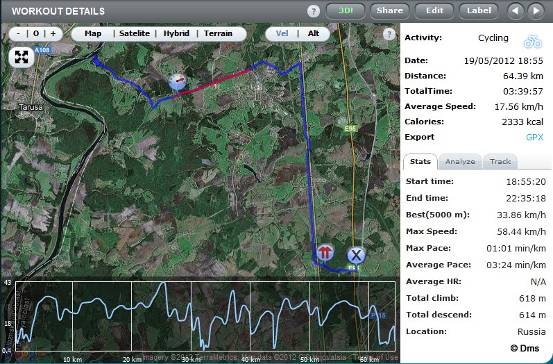 Ну я то думал, коль я в горку еду на пути туда, то обратно я буду с горки катить - как же! Дудки! Оказалось все как по старой велосипедной поговорке "Куда бы ни поехал велосипедист, это всегда будет в гору и против ветра". Стало подсводить четырехглавую на правой, понизил передачу, увеличил каденс и отпустило. Вообще это оказалась самая тяжелая моя велопоездка. У меня в Москве не встречается такого рельефа.
