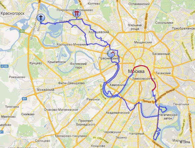 .Начитавшись Лешкиных постов насчет кормления себя водой во время каталки, заехал в Ювенту и купил изотоника сухого - благо флягу я заполнил свежей прохладной водицей. Докатил до Лужников, стрельнул в сосисочной ложечку(ложечек не было - стрельнул вилочку), сел на лавочку и стал готовить напиток. Открыл банку, а там белый-белый порошок (соседка барышня подозрительно уставилась на мое действо), взял вилочкой и во фляжку бросил 4 порции, размешал, выпил половину, из вежливости предложил и барышне, уж очень пристально она посматривала на приготовления :) Девушка оказалась и я поехал дальше мимо кремля в сторону Коломенского, по набережным до стадиона Торпедо и до Симонова монастыря. Очень накатисто шел - средняя скорость на этом участке была 30 км/ч. Выкатил к 3-ему кольцу, пешком по очень высокому надземному переходу и поехал к старице москвы реки, сейчас она огорожена. Кста! В ней зимуют речные трамвайчики! Выкатил к пруду, пересек Андропова и прокатил по парку - 60 лет Октября. А вот 70 лет октября уже нет таких ни парков ни улиц, а так прикинуть еще 5 лет и будет 100 лет Октября. В этом парке действительно было где немного кросс-кантрить. Правда пока по берегу катал, заехал в такие дебри. Выезжаю по тропочке, похоже только я видел эту тропочку, смотрю чуть не наехал на пикниковый стол. Мужики вытращились: "ты откуда такой взялся, заблудился что ли?!", "Не, это мой самый любимый маршрут! А вы что, хотите меня шашлыком угостить?! :) ", на что дядька:"Извини дарагой, растерялся, садись за стол, ешь, что хочешь!", поблагодарил за хлебосольство и покатил на мост через москву-реку, в сторону м.Коломенской. В парке много народа, а сейчас везде много народа. Прокатил, посмотрел, что уже видел не раз и поехал к дворцу Алексея Михайловича, чай не фигня какая, а восьмое чудо света :)
