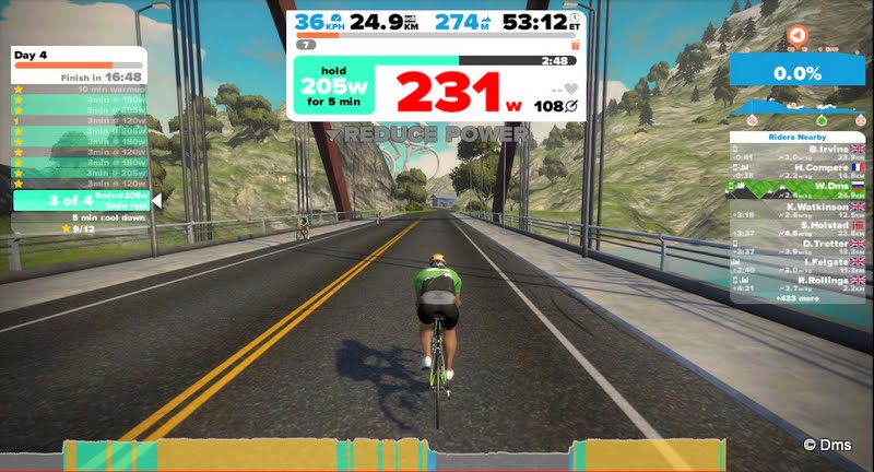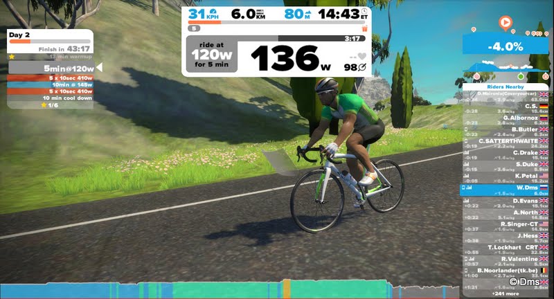 Есть две виртуальные шоссейные трассы. Одна в Richmond, VA, есть на самом деле и очень хорошо воспроизведена, и вторая на другом краю света на маленьком островке затерявшемся между Соломоновыми островами и Вануату. Рельеф везде неплохой, много народа с кем можно посоревноваться, есть разные майки гороховые для горняков и зеленые для спринтеров. В страве сделано много отрезков каждой из трасс, на которых можно посмотреть свое время, сравнить с другими гонщиками. Звифт дает возможность посидеть на колесе у другого гонщика или бота. В Звифте есть тренировочные планы, по которым можно позаниматься. Там и интервалы и восстановительные тренировки. Настроенные на увеличение FTP или на улучшение педаляжа или еще чего. Я включился в 12-ти недельный план по поднятию FTP. Удобные тренировки по часу. Можно сидеть смотреть в ноутбук, отслеживать, как нужно крутить и посматривать Дискавери по телевизору. Конечно можно и просто крутить по трассе, гоняясь с другими участниками и улучшая результаты в страве.