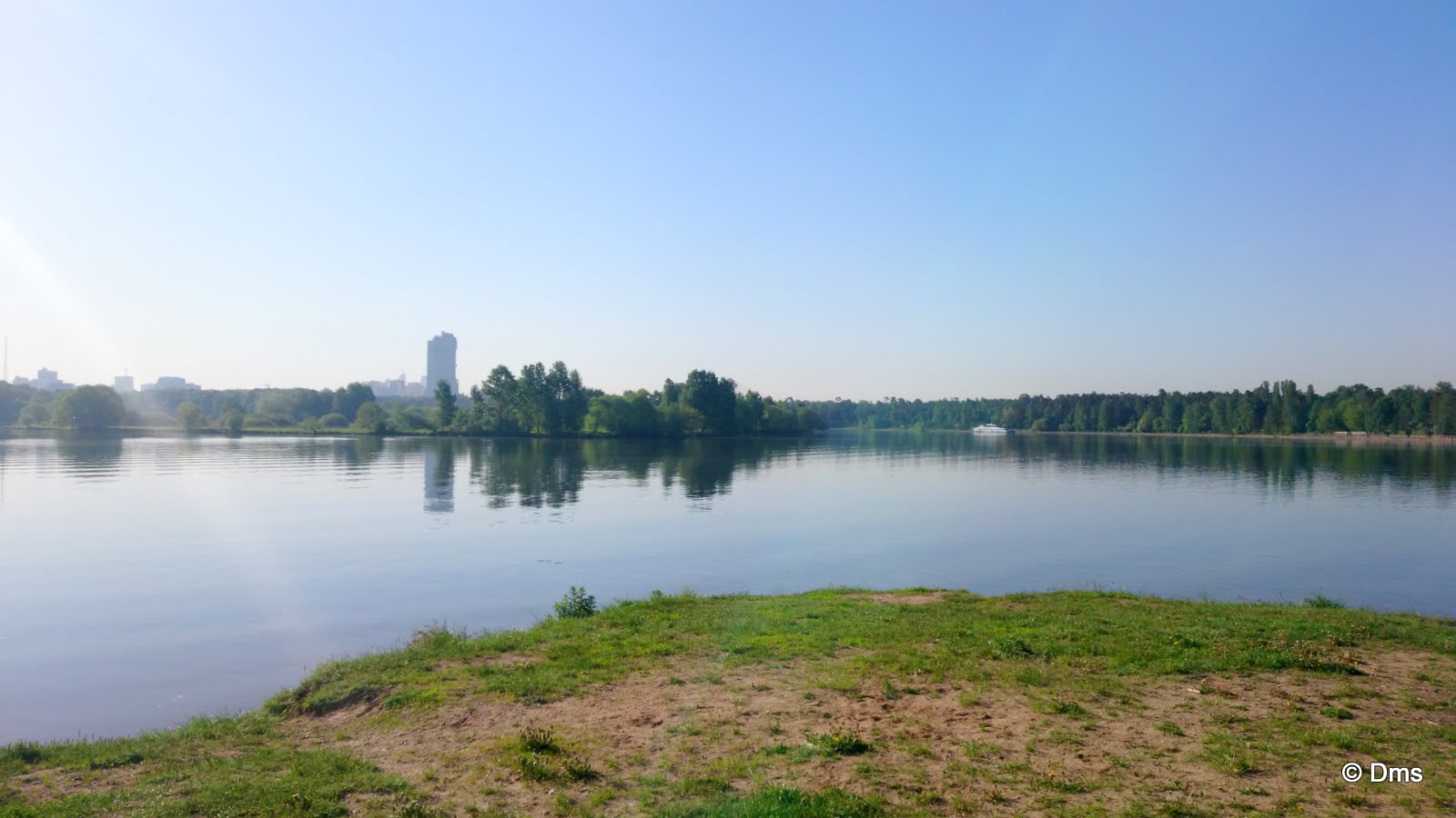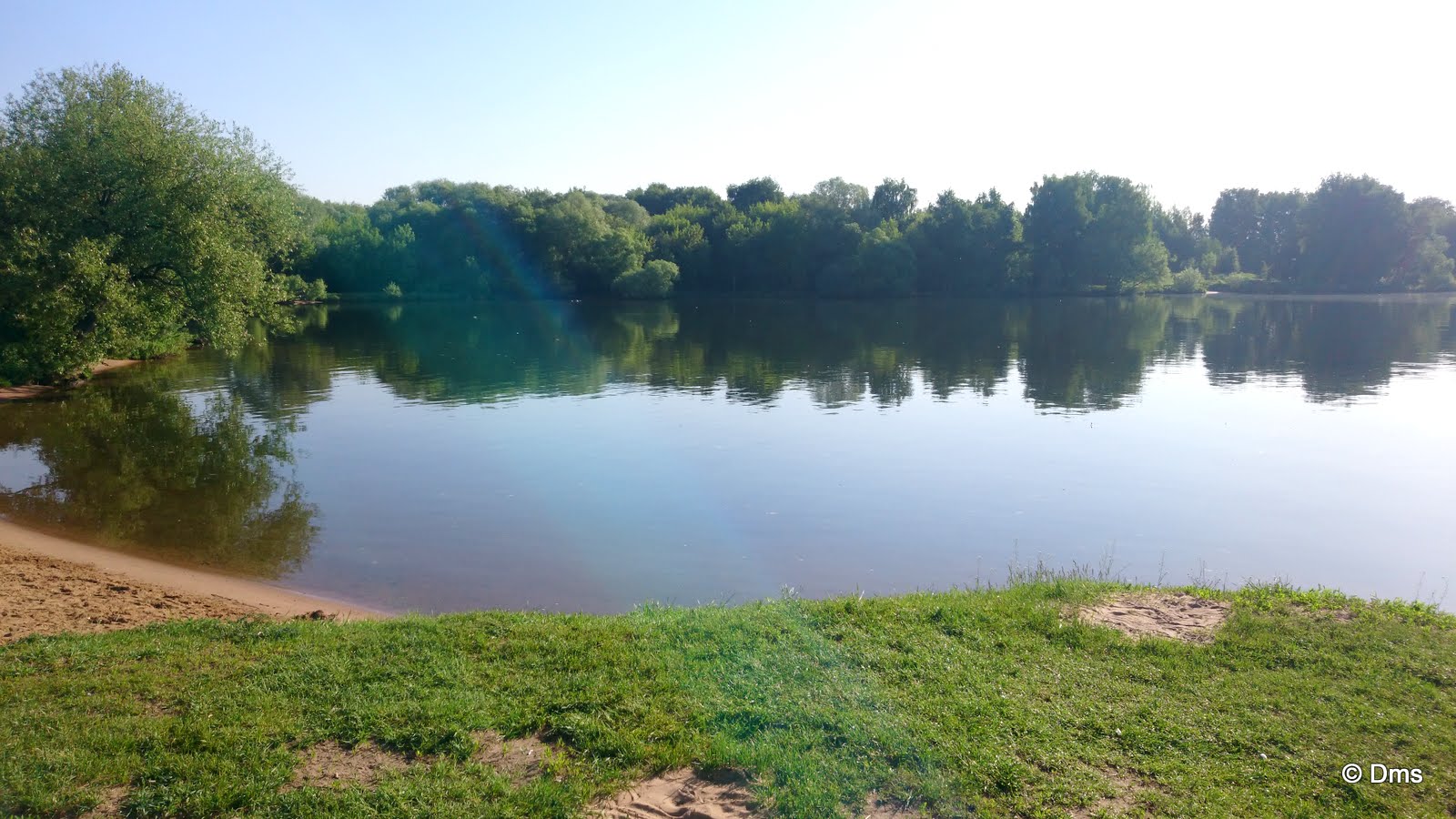 Красиво, птички поют, пахнет цветением. Но бежать, жуть, как тяжело. Я весь мокрым стал в один момент. Бегу на пульсе 135 и пыхчу, как паровоз. Переходил пару раз на ходьбу, зачем себя насиловать. Пробежал три километра, смотрю - по времени уже пора ехать искупаться и домой, завтракать и на работу. Вел охранял пес - никого не подпускал и отчаянно тявкал. Сел на вел и поехал на пляж напротив Серебряного бора.