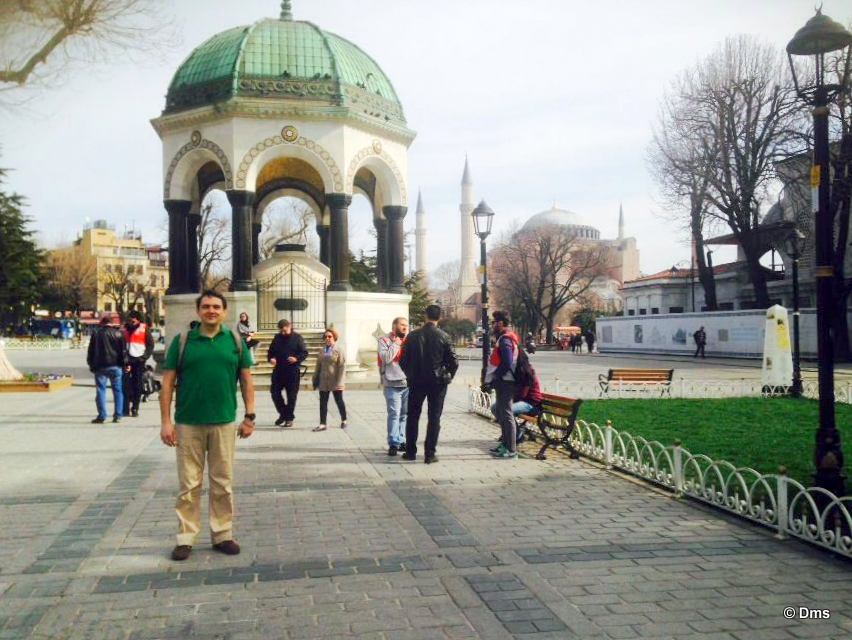 По трамвайным путям идете направо, в горку – минут 10, держите курс на мечеть с шестью минаретами, это Голубая мечеть, выходите на площадь с фонтаном (утром фонтан может еще не работать, и представлять собой круглый бассейн) и видите слева громаду Айя-Софии, Голубая мечеть напротив, справа от вас. Начните с Айя-Софии, она заслуживает того, чтобы ее воспринимали на свежую голову. Вход 25 лир + очень рекомендую взять аудиогид (можно один на всех), там рассказывают много интересного. По времени займет не меньше часа – это если бегом бежать. пройти его насквозь и повернуть налево, вход в самом конце, бесплатный. На входе положено снимать обувь - всем, и надевать платочек - девочкам (у кого нету - выдают). Займет примерно полчаса времени. идите туда. Взгляните на Обелиск, Египетскую колонну, змеиную колонну – сейчас вы идете по Ипподрому, где в византийские времена проходили бега колесниц. Двигаясь по бульвару в направлении Айя Софии, полюбуйтесь на Немецкий фонтан… Доходите до трамвайных путей, они поворачивают налево по улице Диван-Йолу (кстати, по ней приятно гулять вечером, там всякие сувенирные лавки, рестораны и прочие приятные места), а вы сворачиваете налево на следующей улице, за каменной башенкой в яме (это Милион, центр Империи). Видите с левой стороны небольшое зданьице, типа сарай или сторожка. Вам сюда. Это Цистерна Йеребатан. Вход 10 лир, займет… ну, минут 40, не меньше, может, и час. Не забудьте кинуть монетку в воду!