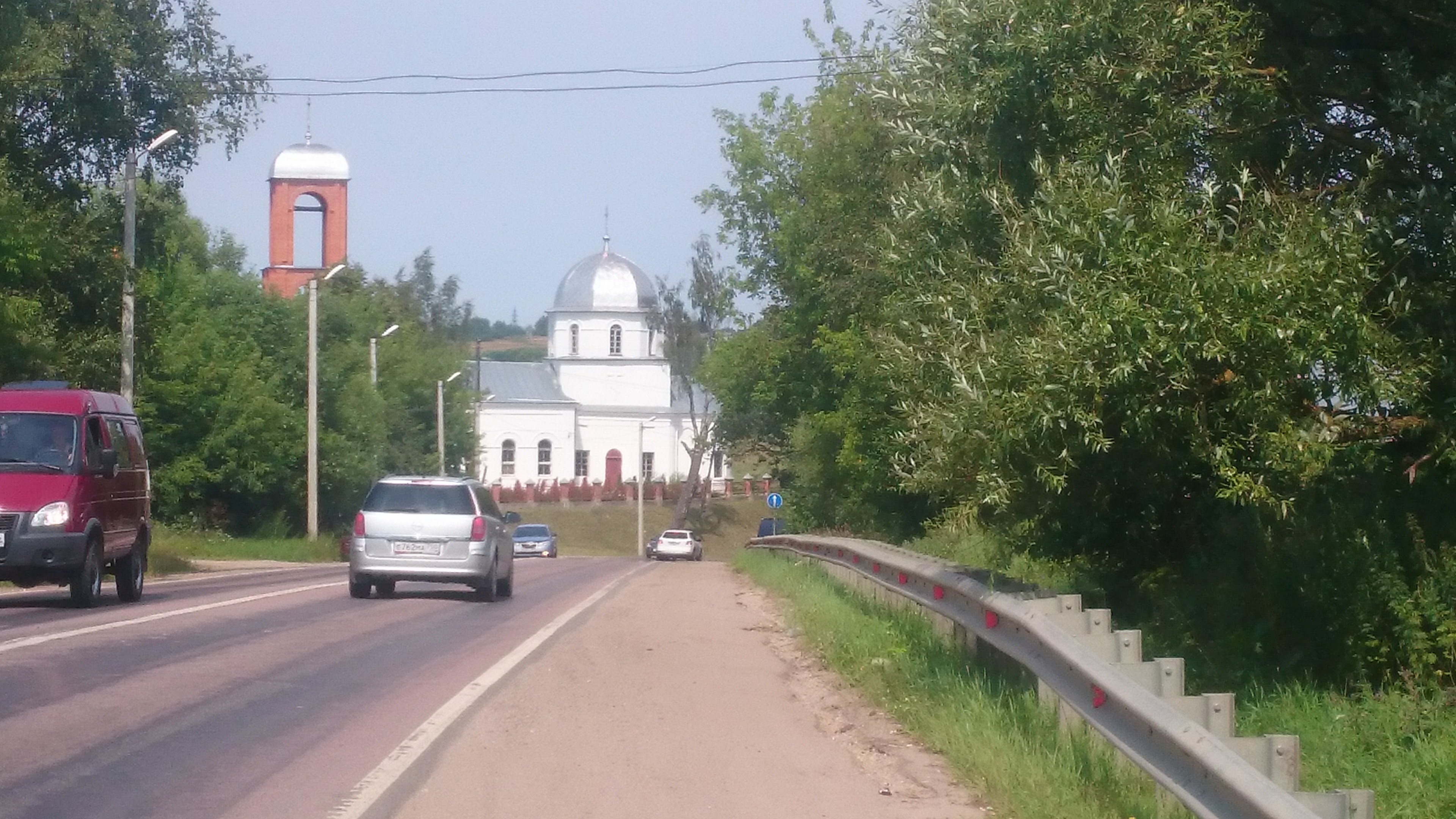 Выехали мы с первого КП и заблудились. Ну не знаем я куда ехать. По легенде вроде по главной еще десять километров. Но что-то не туда заезжается. Хорошо хоть трек в страву загрузил, до этого руки дошли. Смотрю - не там, далеко уехал. Остановил автомобилиста, спросил, где здесь дорога на Сергиев посад. Поехал по этой дороге. Глянул на трек бревета - удаляюсь от него. Развернулся, поехал обратно. На встречу мой радонёр с первого КП, я ему машу, мол поехали за мной, но он машет головой и руками мол нам в ту сторону, откуда я ехал. Каждый решил ехать своим путем. Минут пятнадцать я точно потерял в Дмитрове, и потерял не только время, но и группу в которой ехал. Выехал на трек, нашел нужный поворот и вперед. Еду водичку попиваю, конфетки поедаю. В этот раз насыпал в кармашек карамелек Мятные. Так себе карамельки - плохо шли и привкус неприятный во рту - барбариски лучше. Заехал в магазинчик, купил водички и мороженного. Сел в тенечке отдыхаю. Смотрю мимо проезжает парочка наших. О думаю хорошо, при случае догоню и пристроюсь к ним. Доел мороженное, и в путь. Расстояние плавно подкрадывается к середине пути.