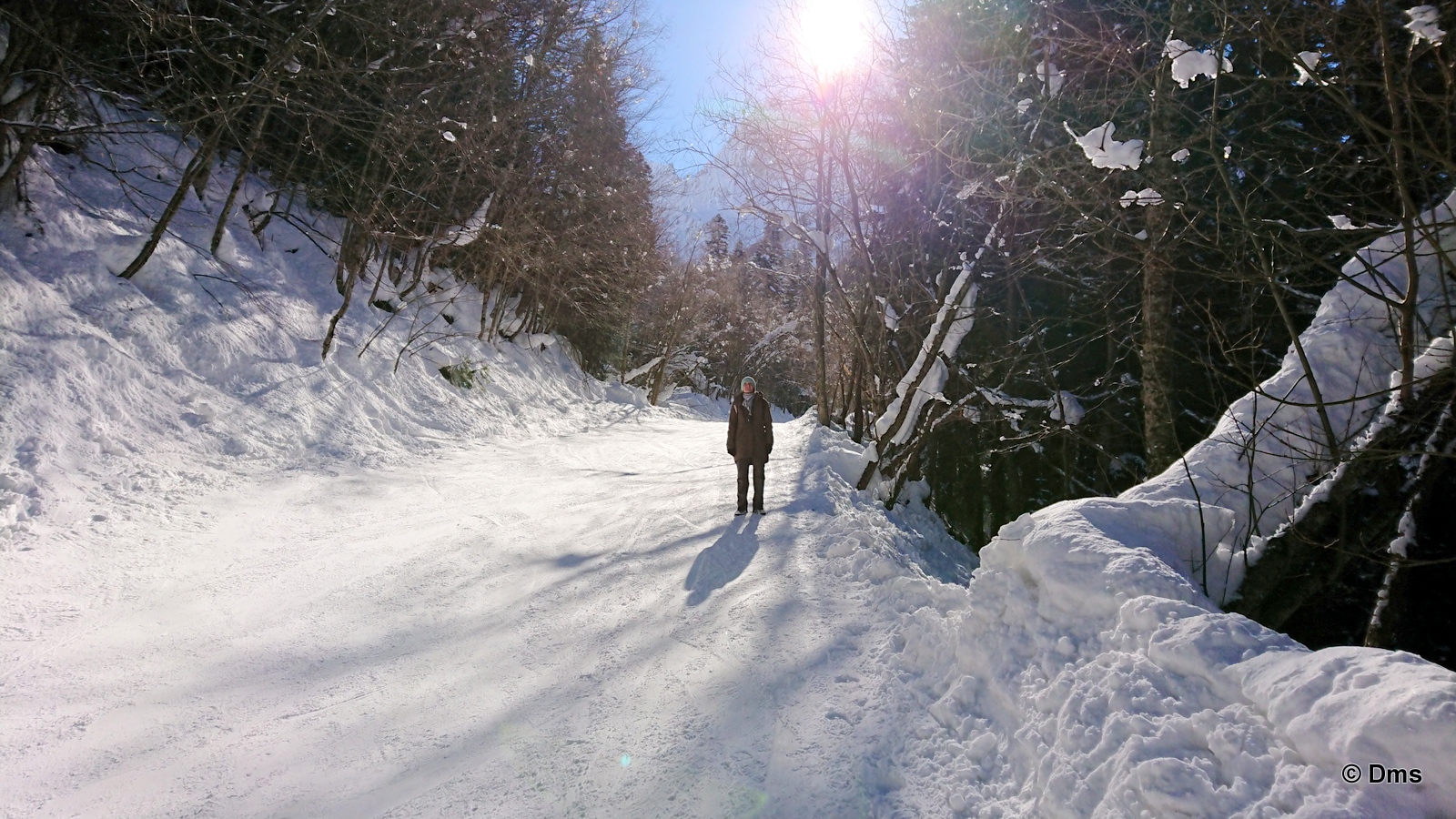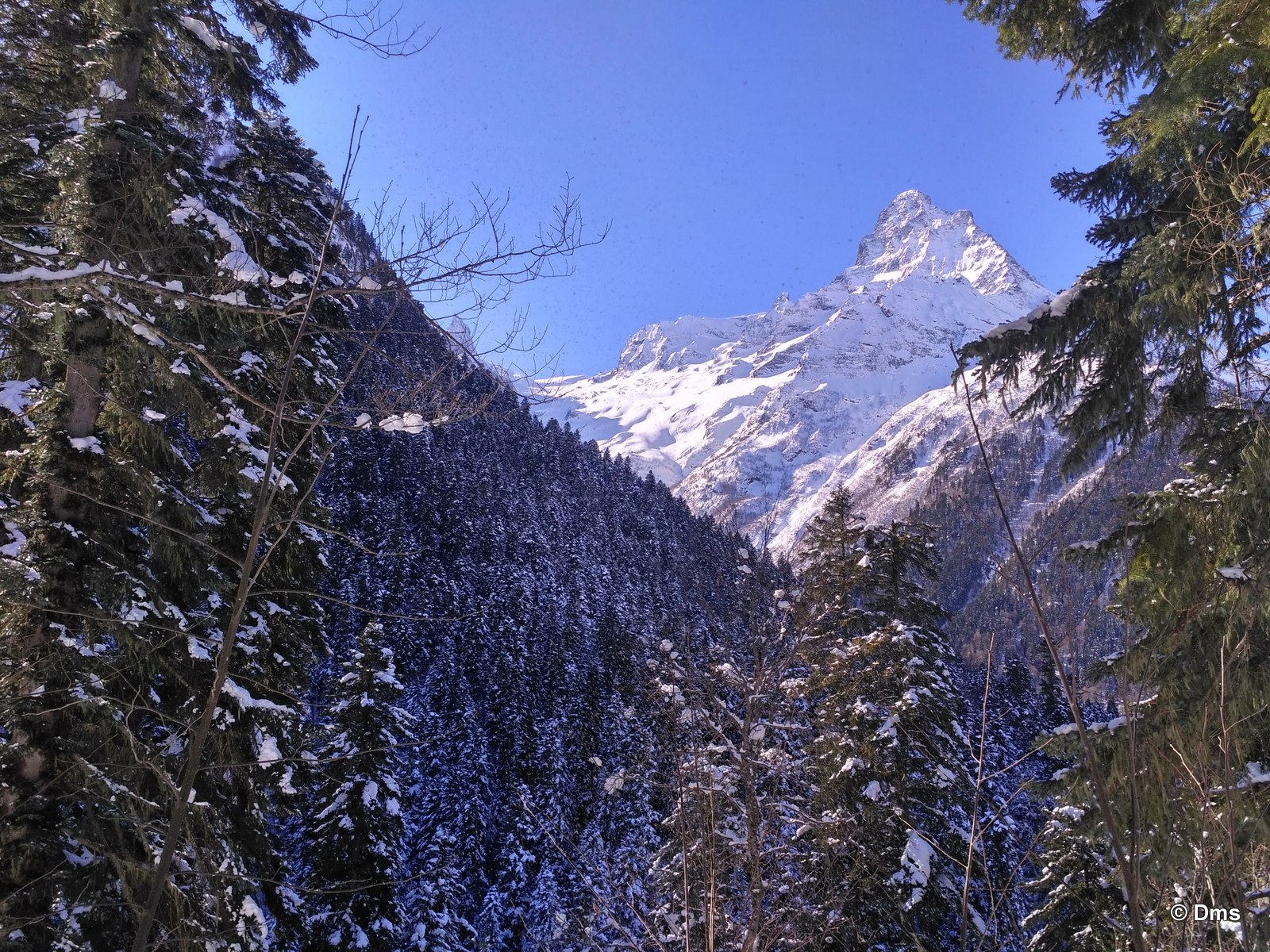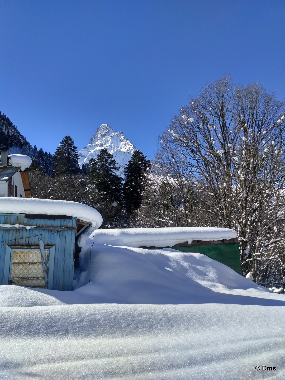 Встали утром, небо синее, солнце сияет. Сходили позавтракали, принесли Ольке завтрак в номер. Олька лежала в кроватке и нежилась. Стас, купивший скипасс на неделю, естественно уехал кататься. Олька сказала, что она не хочет никуда идти, а останется до обеда дома. Еще вчера нас предупредили, что сегодня в одиннадцать будут стрелять из пушек - спускать лавины. Ясно, что высоко поднимать не будут, на горе особо делать нечего. Я и предложил: "А давай пойдем погуляем, здесь вроде есть водопады замерзшие, нарзанные источники..." Звякнули Сережке и нашли поддержку предложения. Решено. Идем гулять до обеда, а с часа возьмем полдневные скипассы и пойдем кататься. Пока собирались началась стрельба, стрельнули раз пятнадцать, мы потом поднимались на Домбай2, видели на склоне шесть рытвин от снарядов, но лавина сошла не там. А где-то дальше по Аманаузскому ущелью. Сначала хлопок, а потом эдакий гром раскатистый.