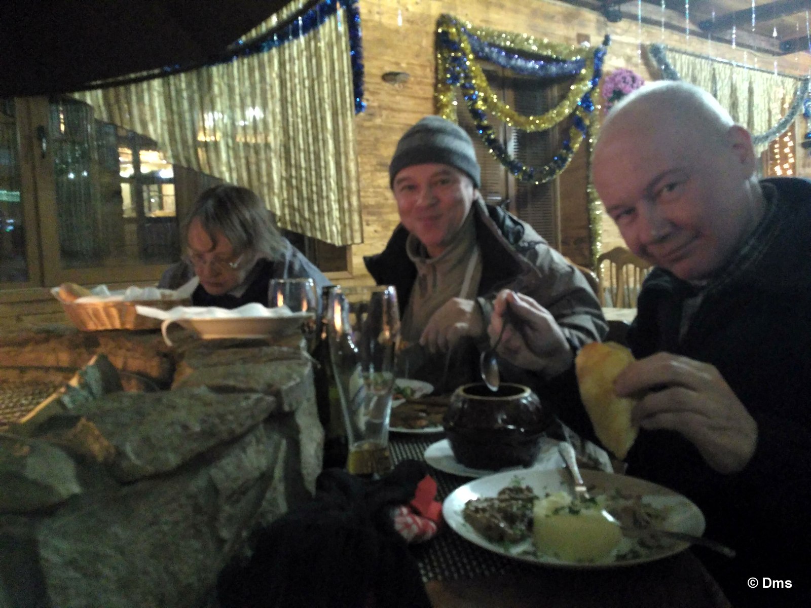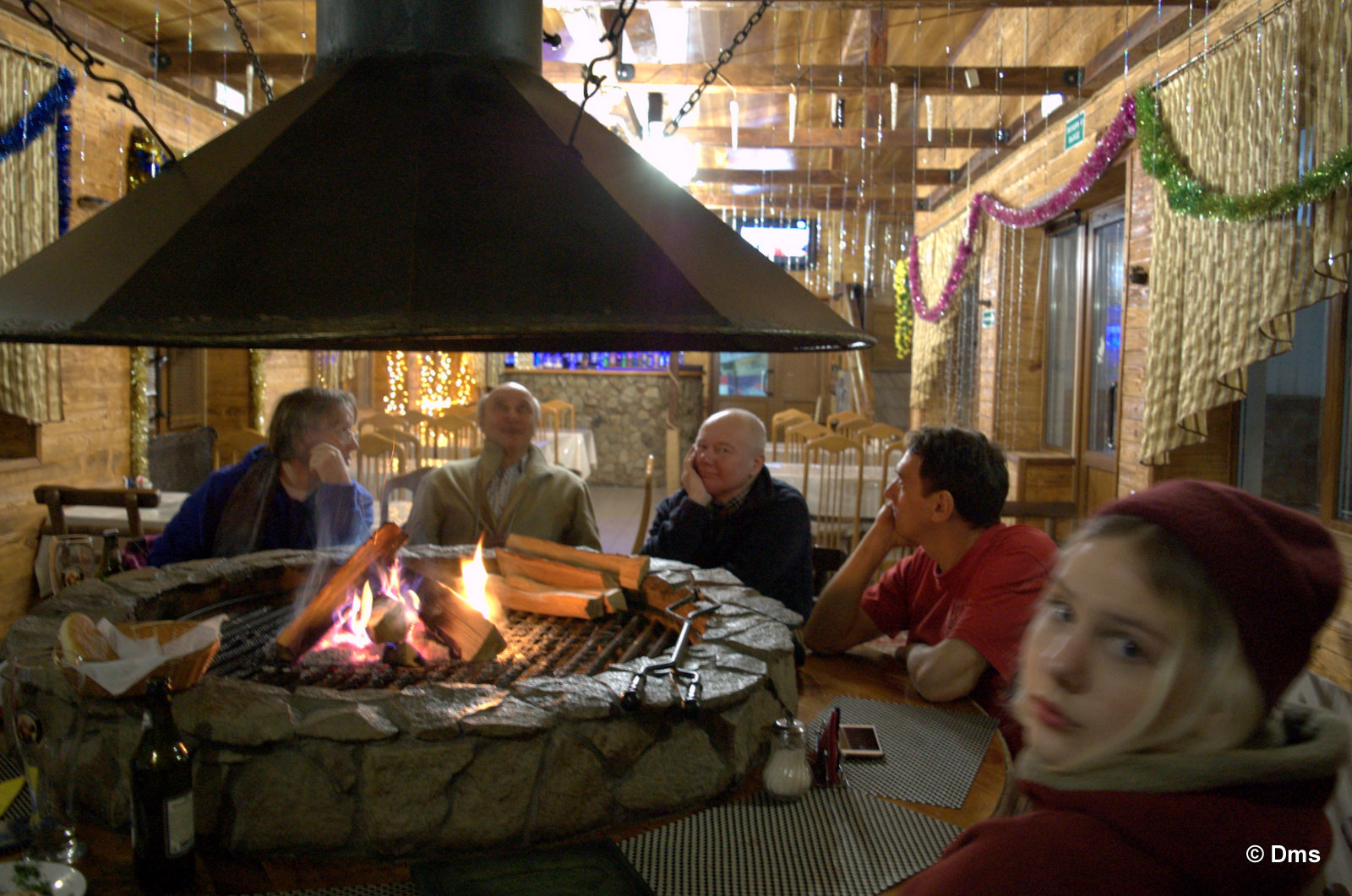 Пришли мы после каталки, слопали пакетиковых супчиков, заели им бутерброды с сервелатом. Но через часок организм захотел подкрепиться. И мы пошли разведывать кафе "Орион". Пришли, смотрим у камина сидят ребята. Мы засомневались, а хозяйка сказала, чтоб подсаживались, тут так принято. Уйдут одни - придут другие. Кто не хочет сидеть у огонька, тот может занять стол. У нас с собой была бутылка шампанского, на что хозяйка сказала, мол пить своё нежелательно, и мы убрали многострадальное шампанское до ночных посиделок. Расположились мы у огня, заказали еды.