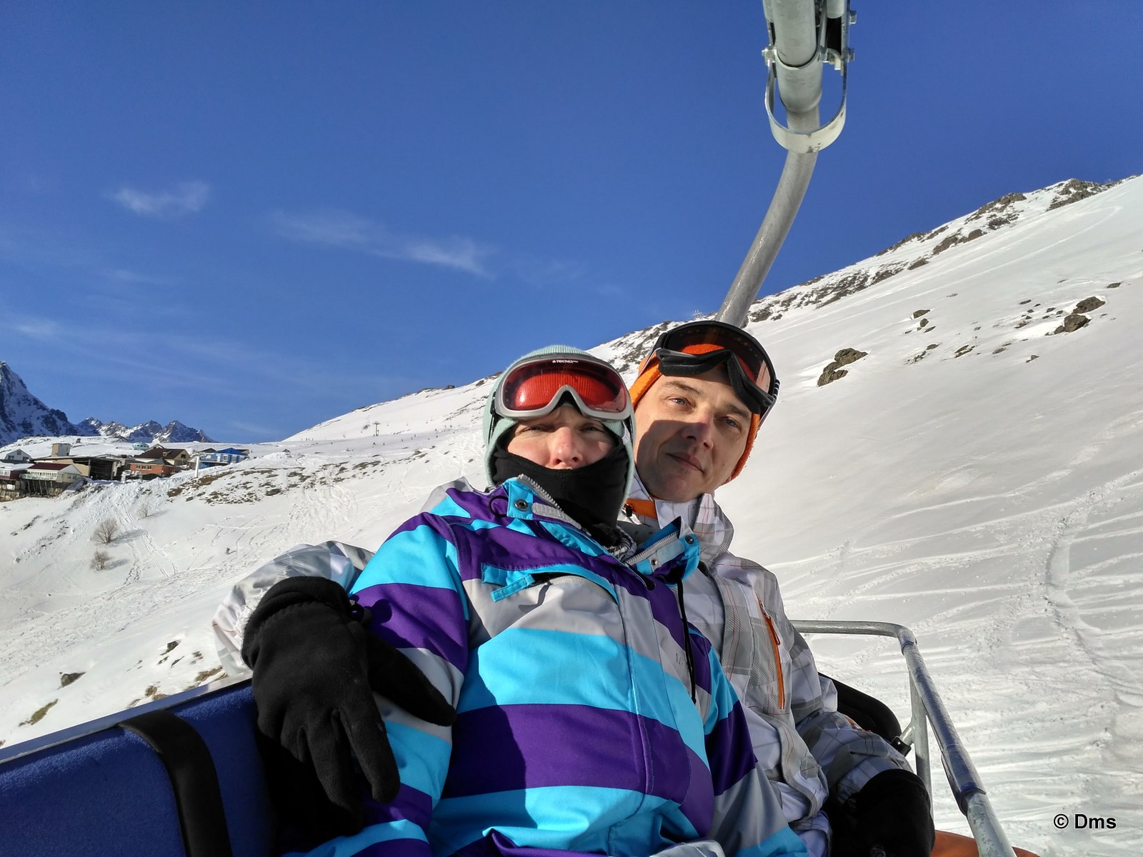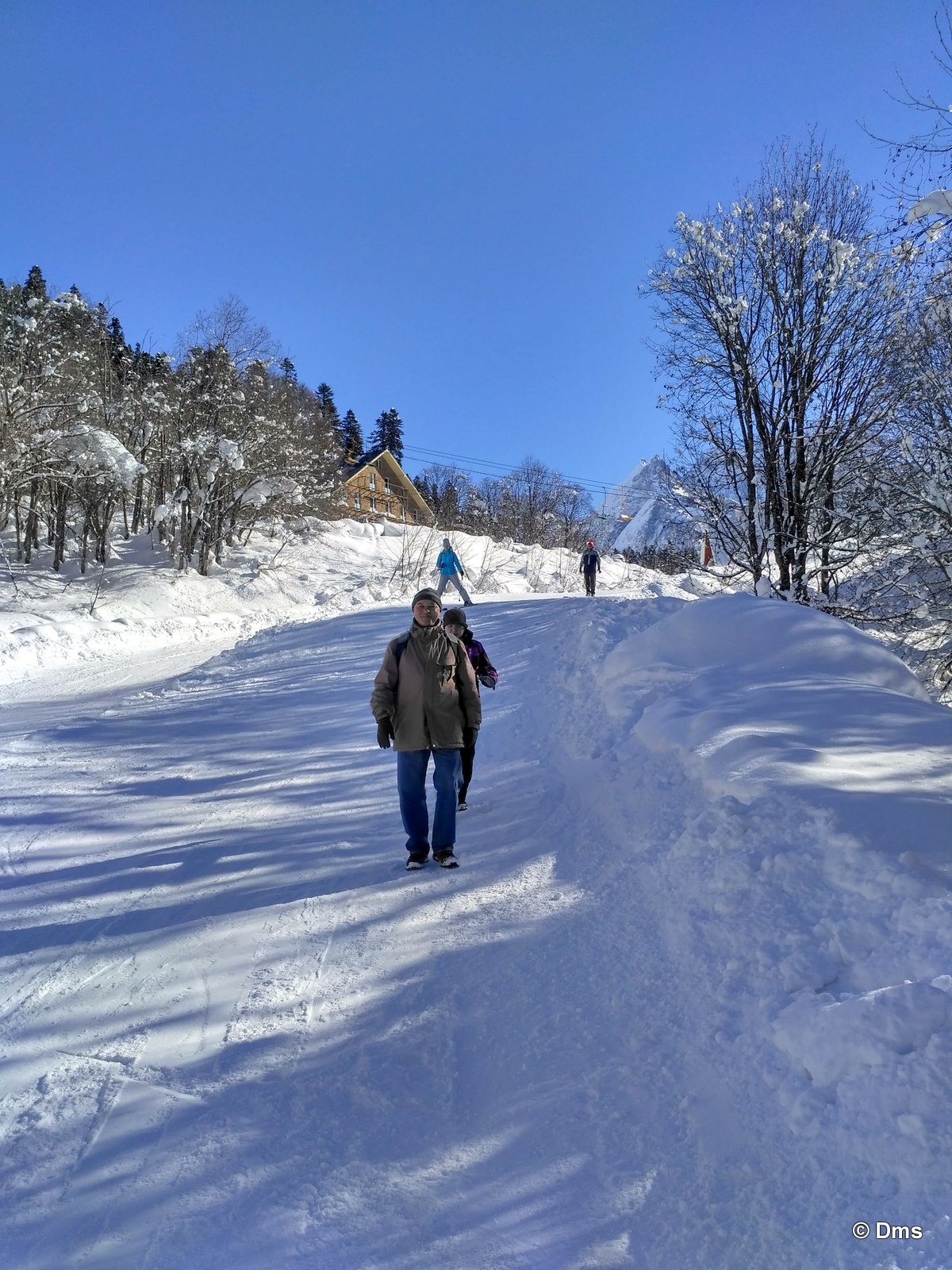 Сережка с Дианой уже купили скипассы на старый на этот день, а мы с мамАанькой пошли покупать билеты на новый подъемник. Сережка с Дианой составили нам компанию. За нами гора Мусса-Ачитара, с которой мы катаемся. Мы на вантовом мосту через