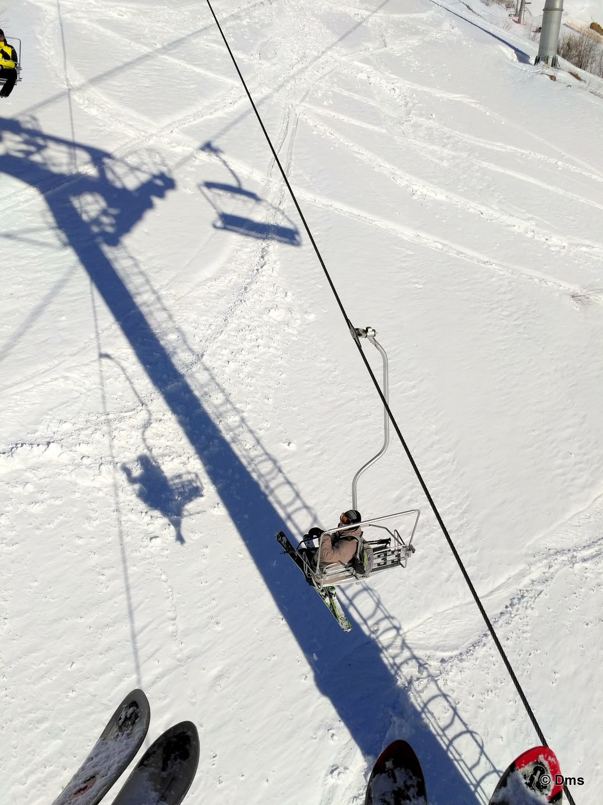 На улице хорошо, уже начинает пахнуть весной. Небо ультрамарин, капель, тепло и кругом снег. Это моя самая любимая погода в году - предтеча весны. И вдруг, чу! Беголыжник. Мы его распросили, что и как. Катает снизу вверх, коньком. Набор бывает до 1500м (напутал что-то поди) Спускается до лошадей, переодевает лыжи и на горных лыжах спускается до поселка.