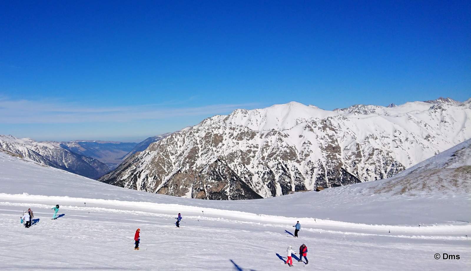 Включили все очереди подъемника. Народу мало, очередей нет. Третья очередь очень медленная, но разочек подняться можно, тем более виды какие. Мне очень понравилась зеленая долина. У нас тут снег, а немого ниже уже что-то зеленеется.