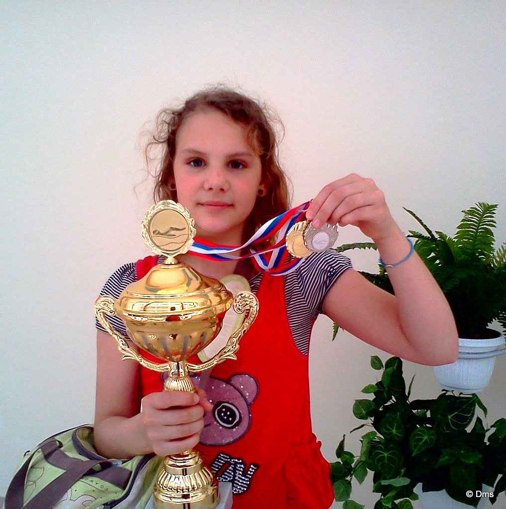 А вчера были заключительные соревнования. К ним Олькин пришла с 26ю очками (10 - 1е место, 8 - 2е, 6 - 3е и тд). Ольгуня заняла 1е место по батерфляю. Очень красиво плыла, смотрел и любовался - аккуратненько, размерянно, гармонично. Затем девочка подошла к нам и сказала, что она не очень хорошо себя чувствует, сходила ко врачу - посидела отдышалась - сняла шапку резиновую с головы, наконец-то и вроде ожила. Потом были старты вольным стилем, Ольгунь отстала см на 40. У первой девочки был результат 38:88, а у Ольгуни 39:03. Но заняла почетное второе место. А потом было награждение и Ольке вручили Кубок школы по плаванью. Вот какая она у нас молодец :)