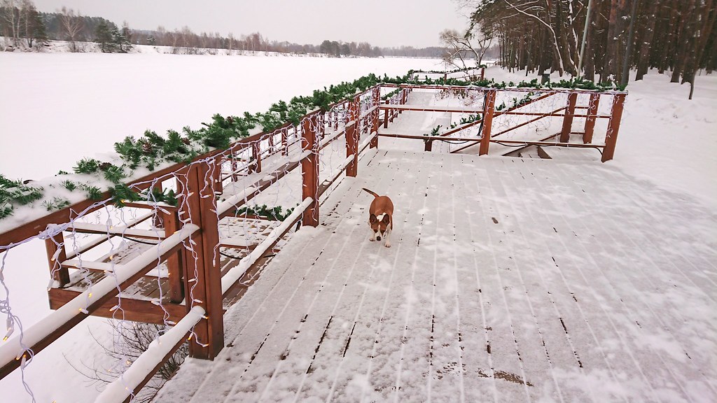 Восьмое - последний день каникул. На лыжах, что-то не захотелось. Решили навестить полюбившийся нам парк Рублево. Дорожки почищены. Лыжня нарезана. Правда "волна" на лыжне дикая и похоже никто по лыжне не ходит, но все равно - лыжня для классики есть. Зашли на собачью площадку, попрыгали с тумбы на тумбу, Пробежались по качелям, между палками змейкой и пошли в сам парк. В парке полно дятлов. И у нас с Анькой забава - услышал дятла, нужно его найти глазами. Это непросто.